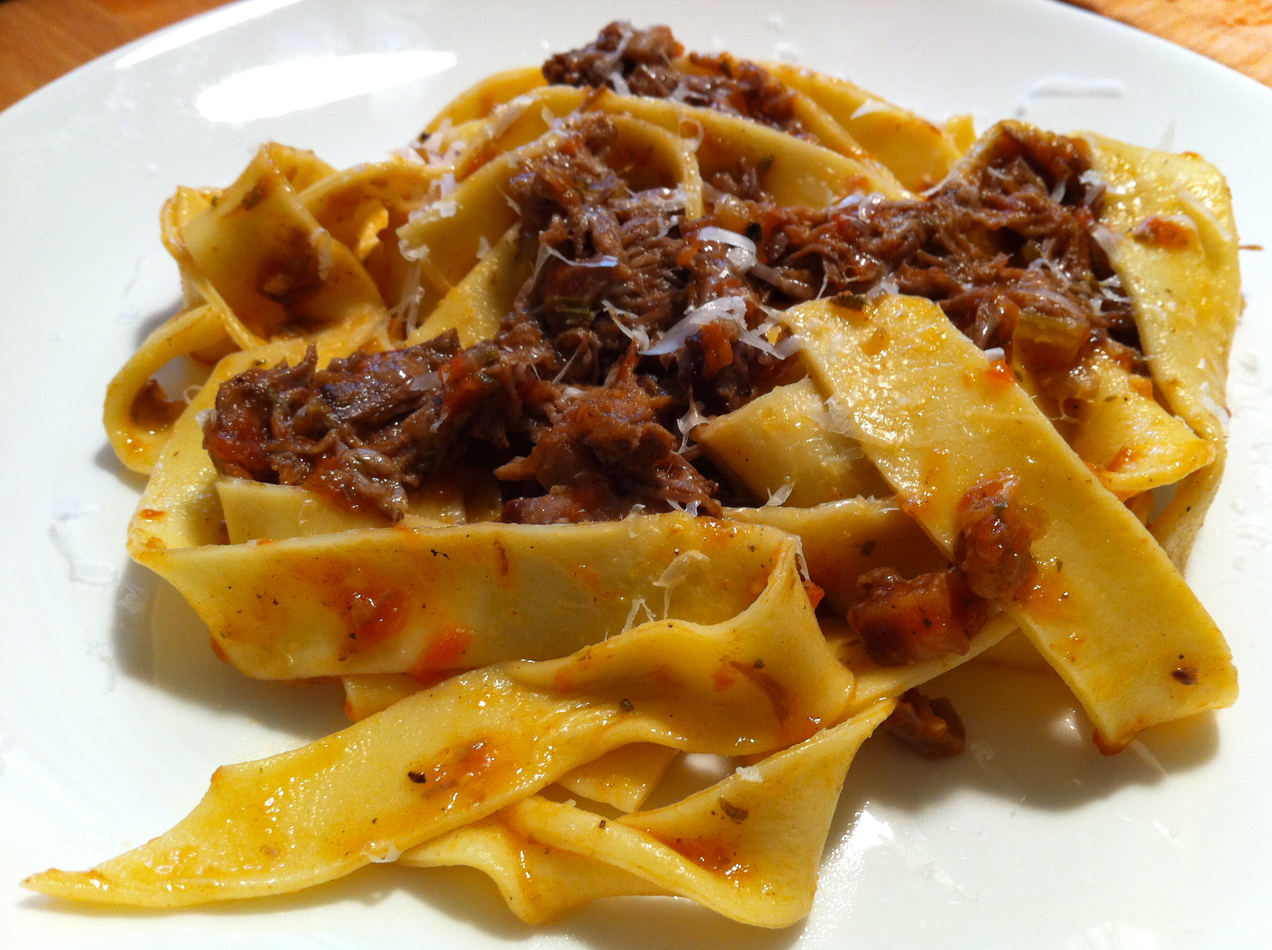 Cut the steak into chunks and brown them and the bone in olive oil. I like to get everything nice and brown. While browning the beef, I took care of the tomatoes. I cut a small x onto the bottom of each tomato, emerse them in boiling water until the skin begins to peel, then submerge them in an ice bath. Next, I remove the skin, seeds, and base of stem, then chop them up finely. Once the beef is browned to your liking, add the onions, carrot, and celery. I chop my mirepoix very finely, how you do it is up to you. Once the mirepoix is soft and looking ready, I add the garlic. The garlic cooks fast and I drop the herbs in just before the garlic is done. Once everything is ready, I deglaze the pan with wine, then add the tomatoes. I like heat and drop a couple chilis in to give the ragu a kick. This concludes the active cooking part of the sauce. All you have to do now is reduce the heat to low, stir occasionally, and add water if things get too dry. I usually simmer my sauces for 4+ hours, but was in a bit of a rush today and was only able to simmer for a little over 2 hours. It was long enough for the meat to become fork tender and that’s all you really need. I removed the bone, the chilies, and the bay leaf, pulled apart the steak, and made sure the ragu was properly seasoned. Since I made ravioli the day before, I went with quick and easy hand cut pasta to go with the ragu.