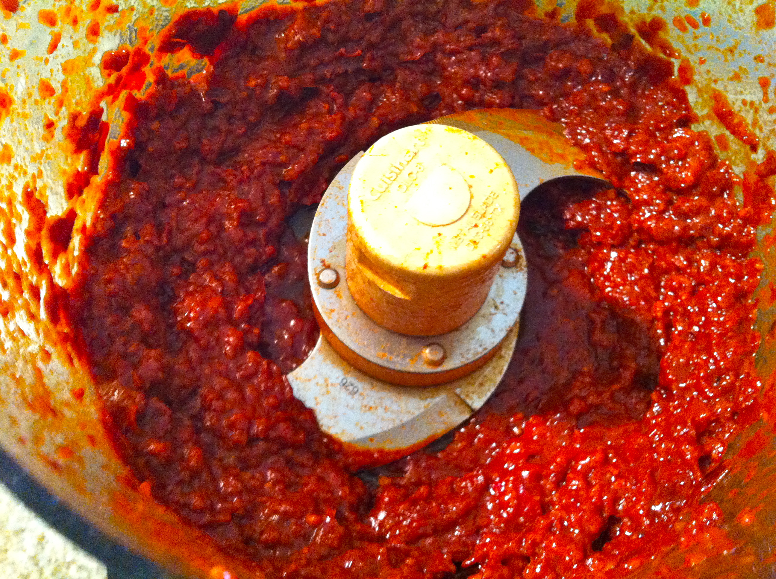 Prior to cooking the head, I removed the ear and set it aside. At this time, I put the ear in a small pan with water and brought it to a boil. I dumped out the scummy water, replaced it with fresh water and returned the ear to a boil. I added cumin, chili powder, salt and pepper, then simmered the ear for about 2.5 hours. While this was going on, I toasted my chilies, then sauteed the other half onion and garlic in the fat I scraped off from the top of the broth. I removed the ear from the pan and used the liquid to rehydrate the chilies, which took about 30 minutes. I put the chillies, onion, and garlic into the food processor with a little of the rehydrating liquid and pulsed it into a paste.