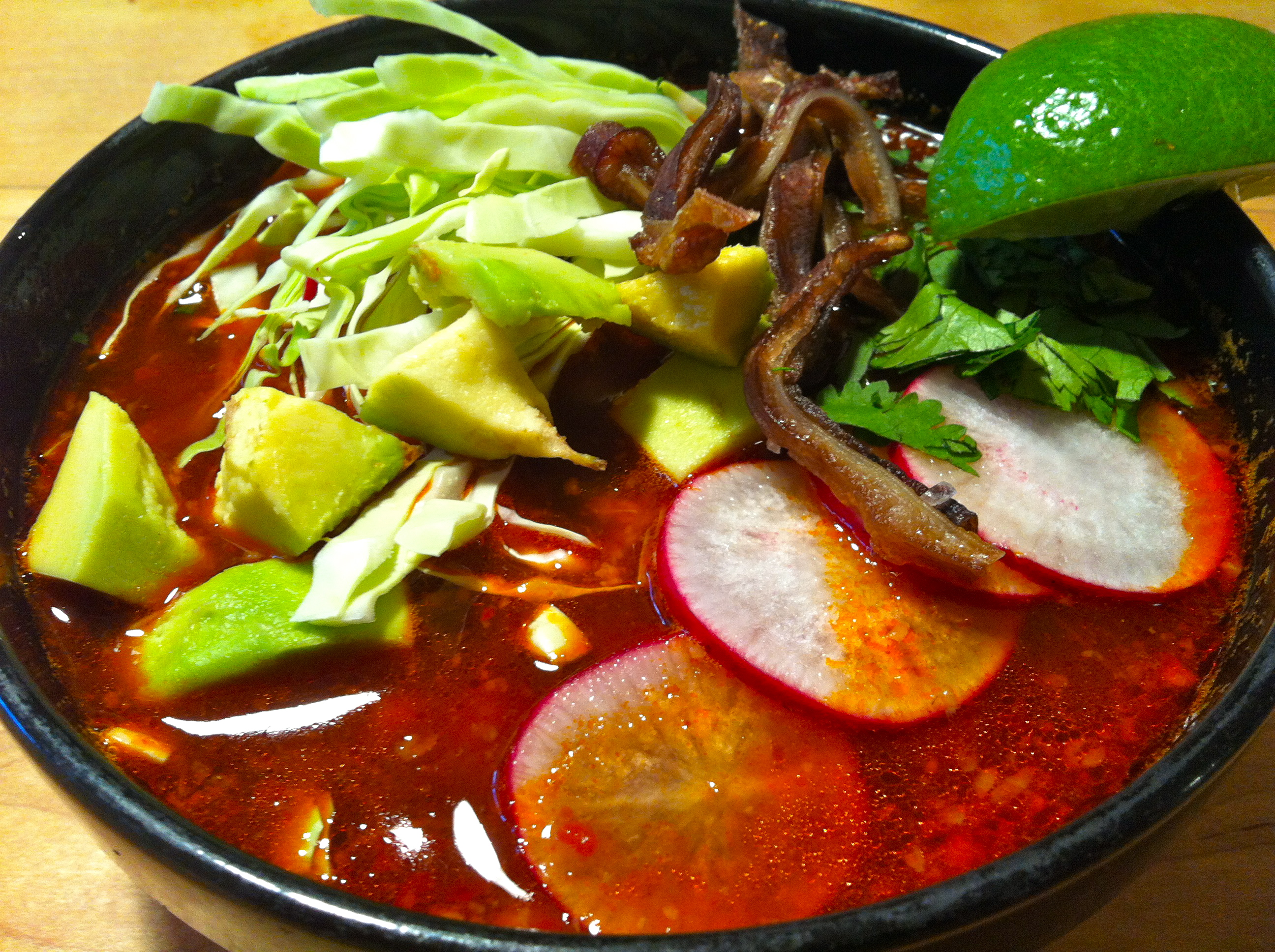 The slices of ear lost their crispiness once they met the broth and will not be including in future pozole endeavors. I also forget Mexican oregano when I was at the market and will be including it next time around. The broth was really good, full of porky richness and a nice amount of heat. The meat was tender, pieces of skin like butter, and the hominy very bean-like. There are relatively few ingredients involved and the only solids in the soup itself are pork and hominy. The garnishes provided interesting textures and, with the exception of the not-so-crispy crispy pig ear, everything in the bowl got along swimmingly. I’m my own harshest critic and was very pleased with the outcome. I have a new favorite soup!